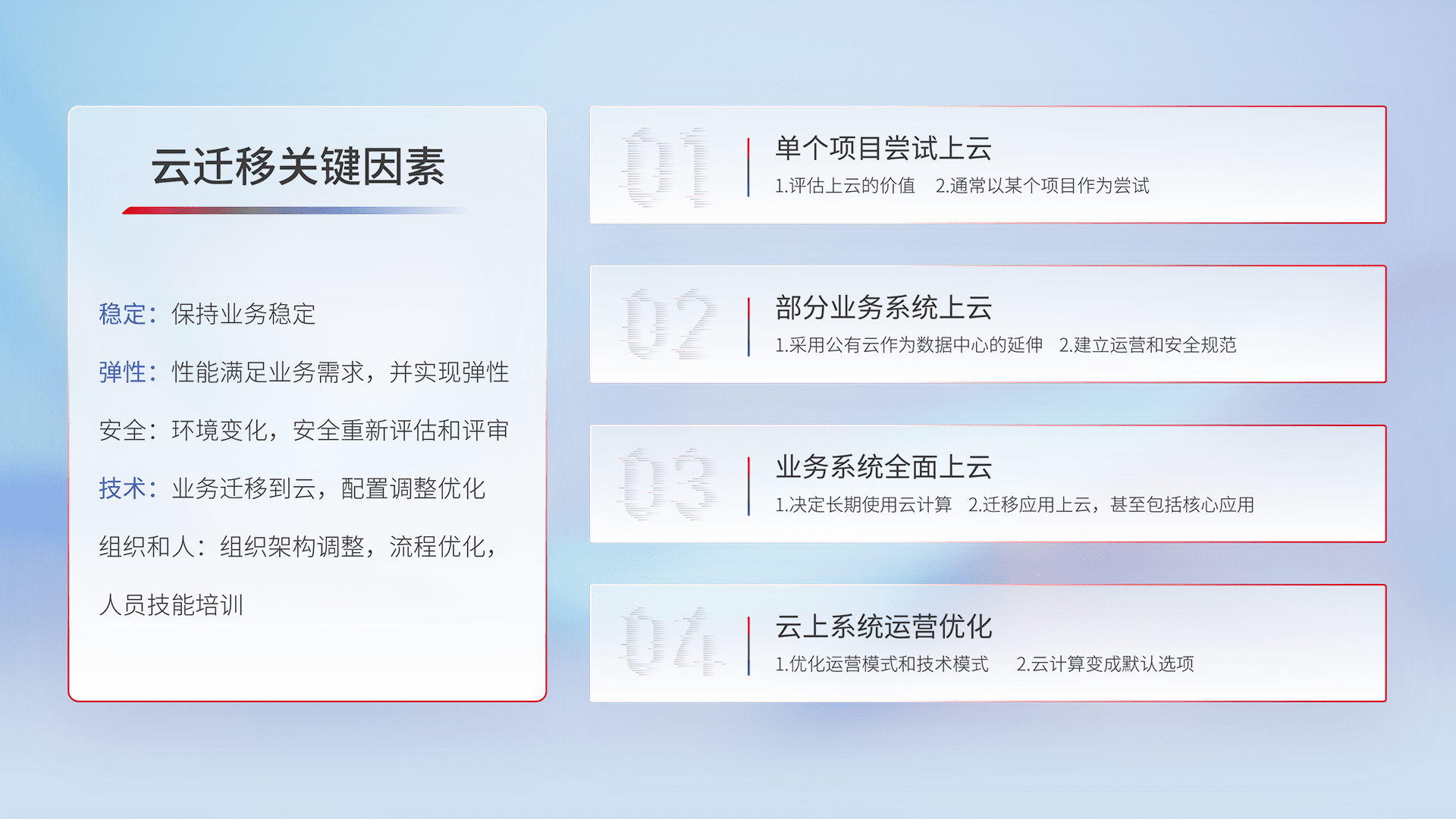 结合实际业务,,,,从规划设计、、、云平台选型、、、云原生改造、、、数据迁移、、、、集成交付,,,,迁移全过程为客户识别最佳上云路径,,,,做好风险识别管理,,,,设计网络架构、、、身份权限、、安全审计合规、、操作审计、、、日志审计、、监控告警策略、、、、多站点容灾设计等,,,对云上基础设施进行整体规划,,,提升IT治理水平,,,以满足弹性、、、高可用、、高性能的需求。。。