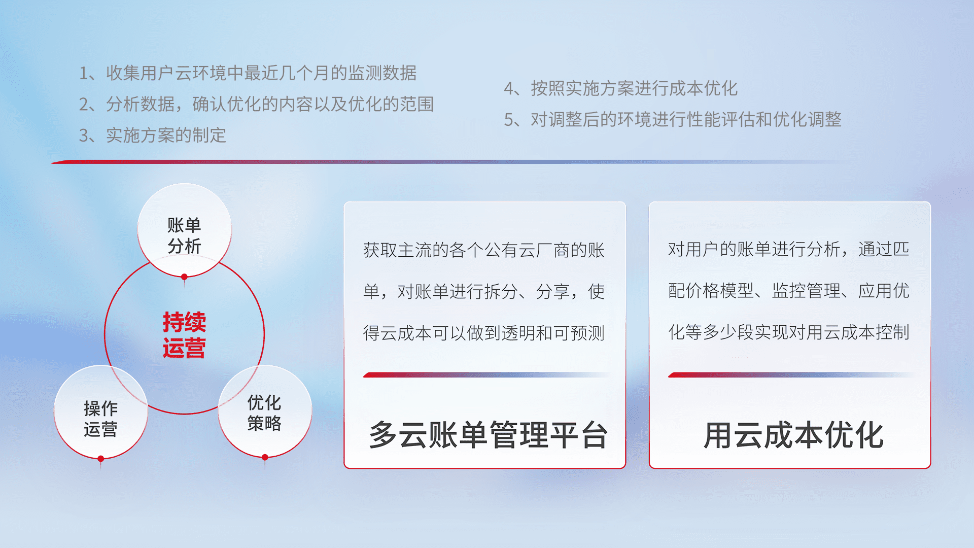 通过多云纳管,,,,以统一的资源数据模型把客户的云资源进行抽象和封装,,进而实现对多云资源的统一操作,,,,保障云资源管理的可靠性、、、稳定性与可用性。。。。量身定制化运维内容,,,配置、、开发运维、、、、补丁管理、、、、备份、、监控、、、、认证和访问管理、、审计和日常巡检等,,,保障在用云过程中的可靠度,,,稳定度以及高可用率。。